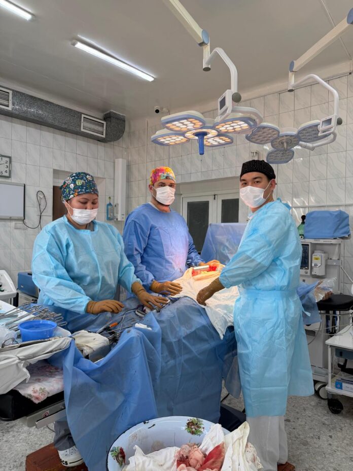 Операцию провела команда ведущих специалистов клиники: заместитель директора по лечебной работе Д.Т. Арыбжанов, заведующий отделением хирургии А.А. Кляцко, врач-хирургий А.А. Наят, анестезиологи-реаниматологи Д.Т. Касымов и М.Ж. Жуманов.