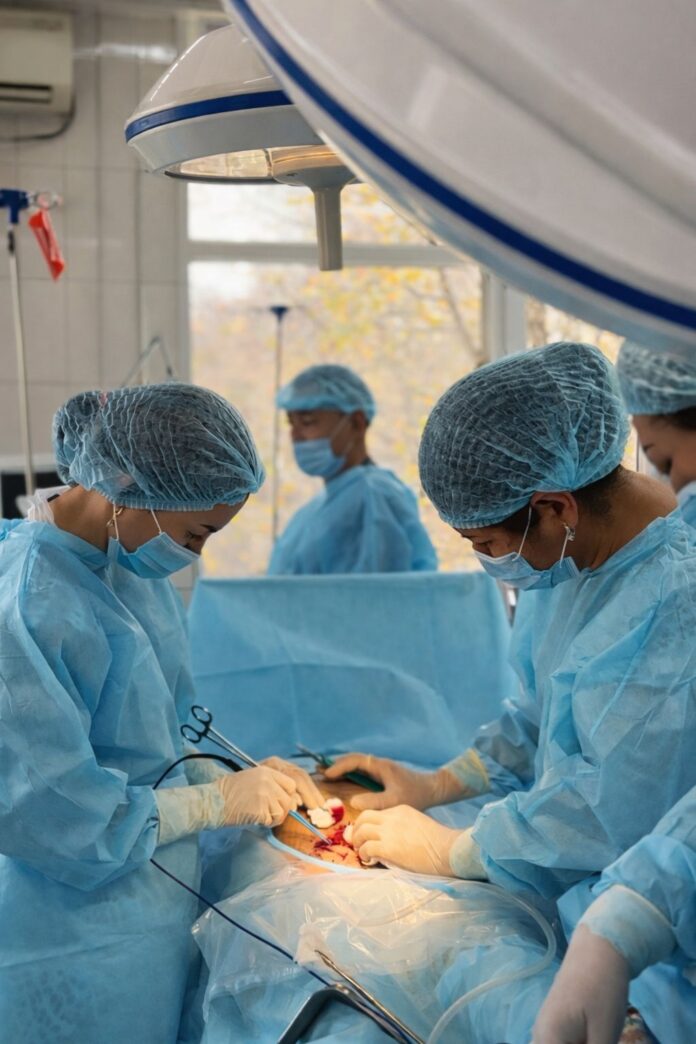 Алматы көпсалалы клиникалық ауруханасы дәрігерлері жүктіліктің 38-аптасында жатқан пациентке күрделі симультанды операция жасады — бір хирургиялық араласу барысында босандырып, сонымен қатар тамырлы ісікті алып тастады.